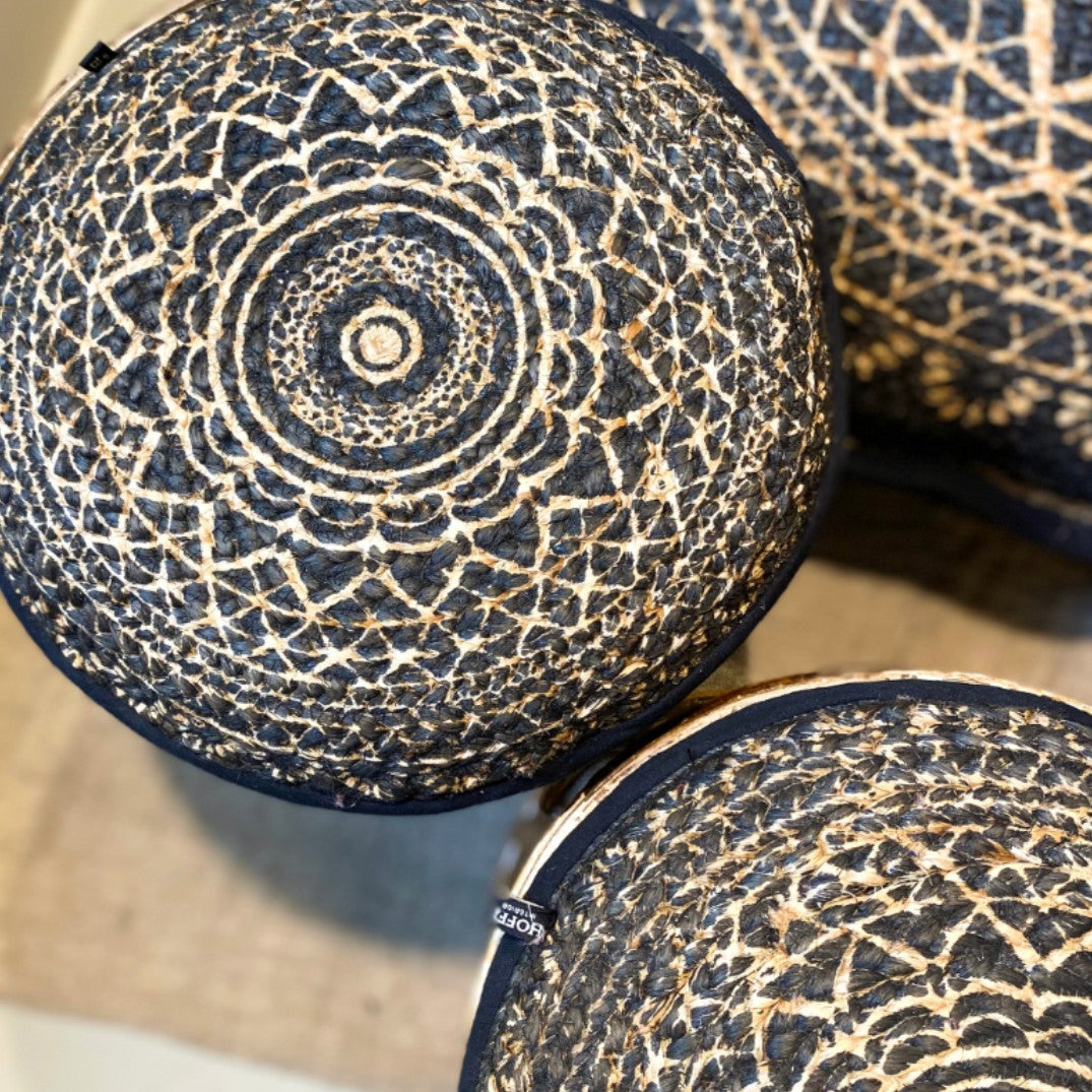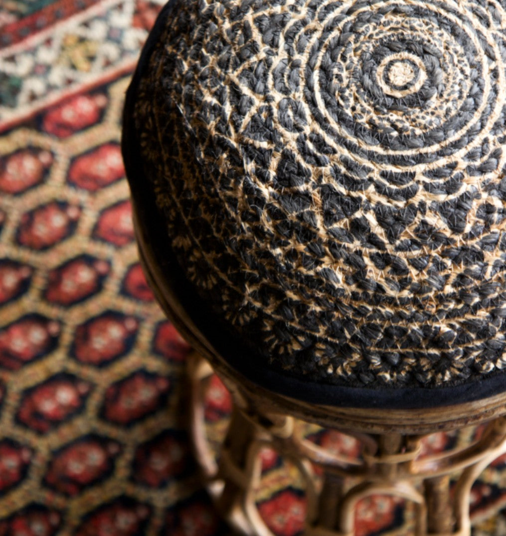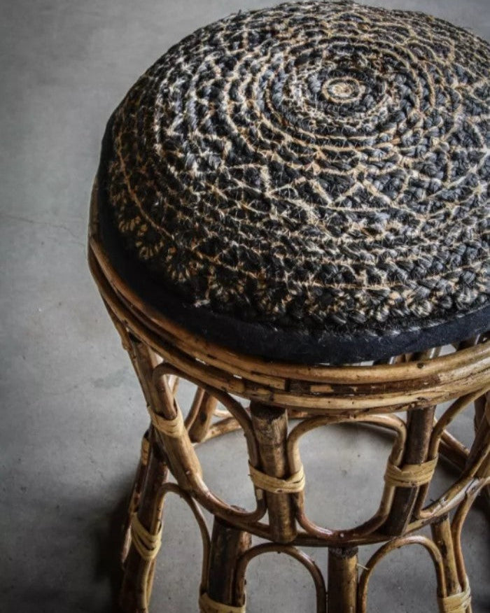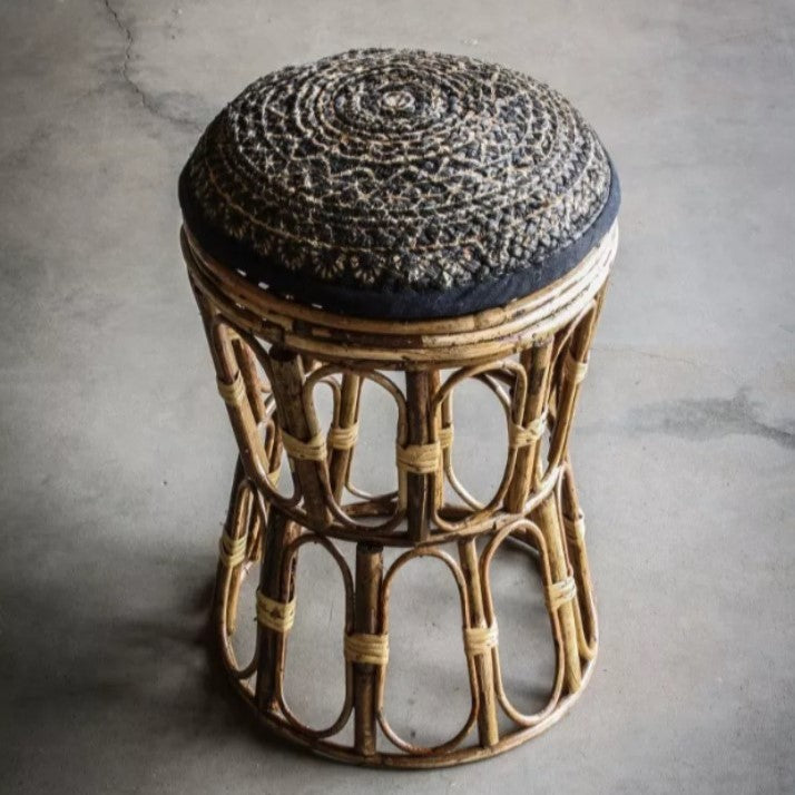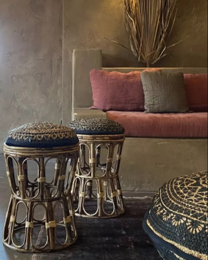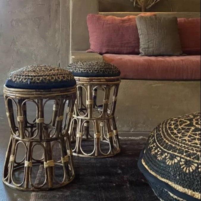 Taburete Nila de Hoffz. Estos taburetes, con un cojín estampado con un elegante diseño, están hechos de bambú y yute. Son perfectos para añadir asientos adicionales a tu hogar, tanto en interiores como en exteriores. Combínalos con los cojines de suelo para un look alegre y cosmopolita. Tenga en cuenta: dMantenga estas heces secas; no les gusta el agua ni la humedad, y la luz solar directa puede hacer que el yute se decolore.