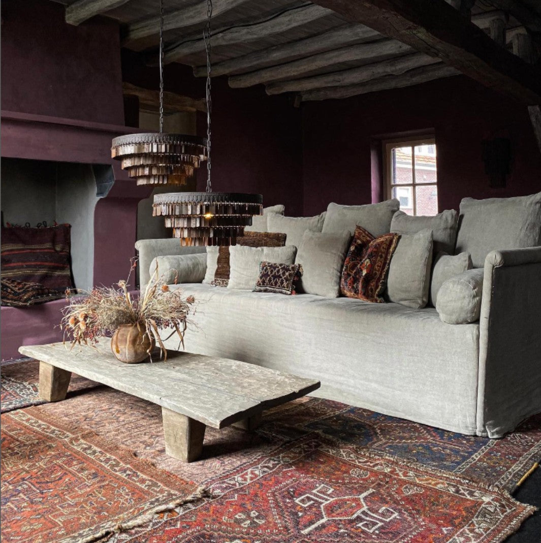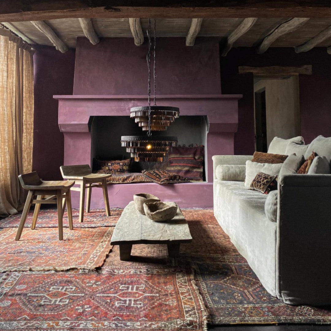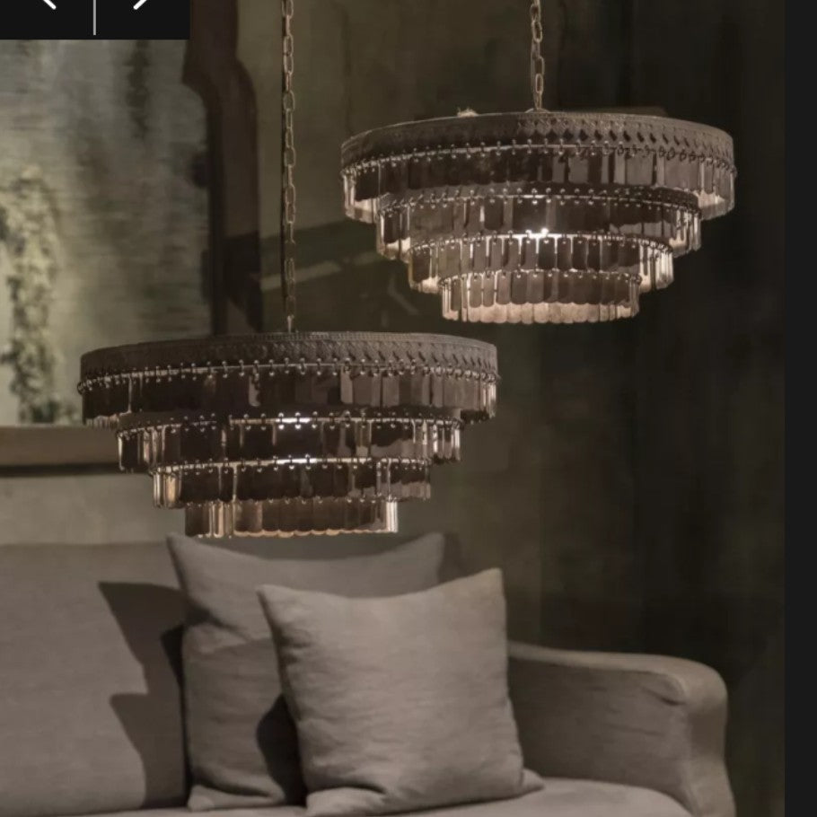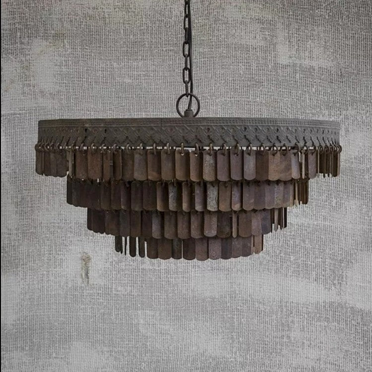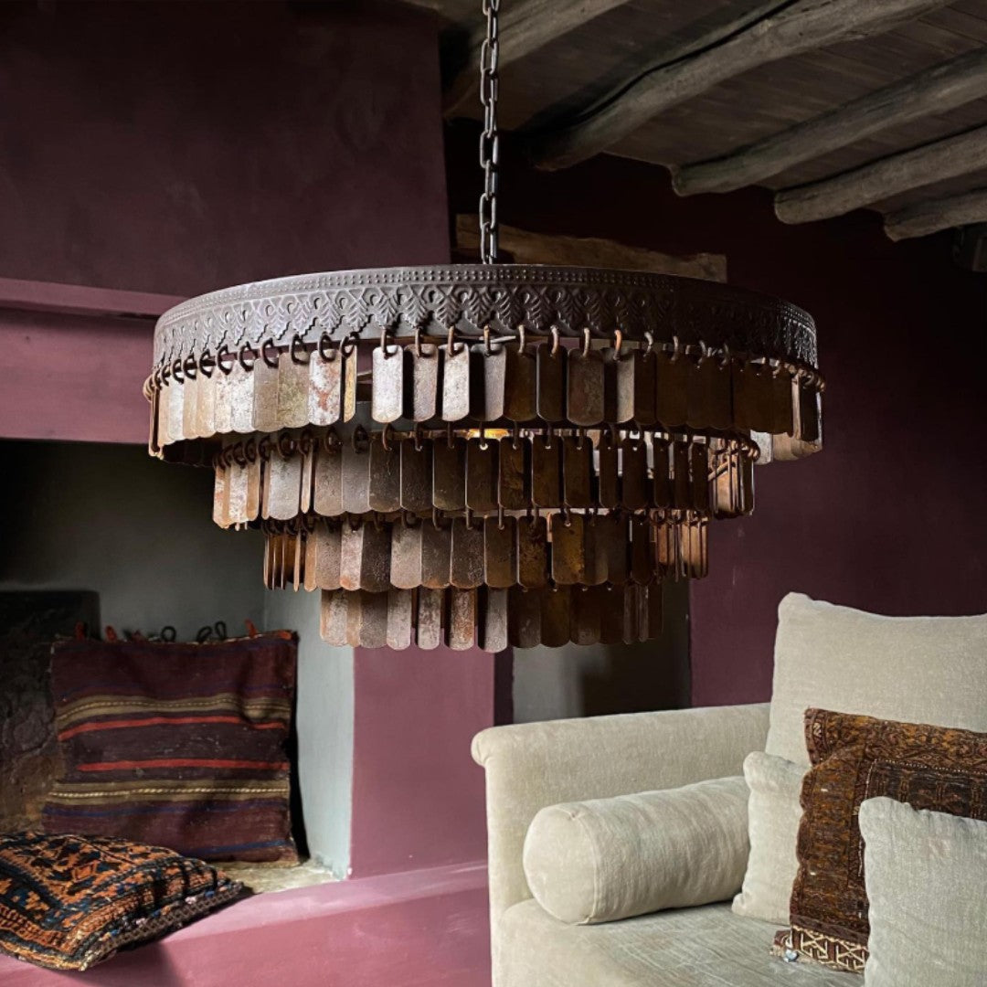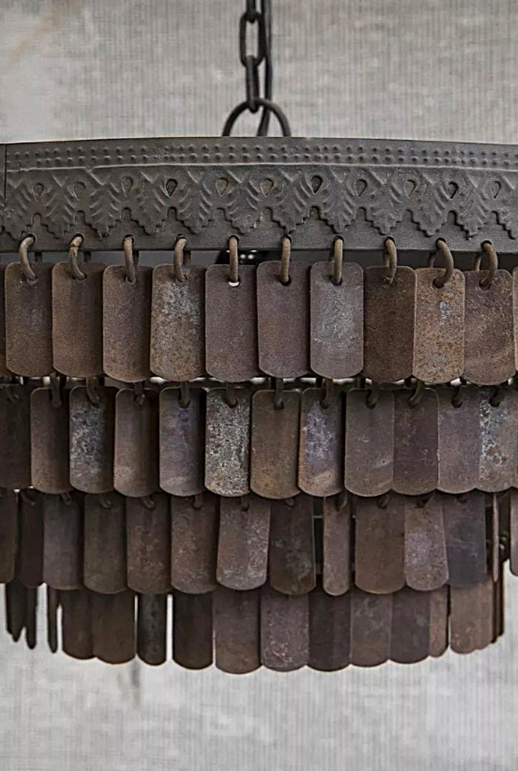 Lámpara colgante Gudha de Hoffz, redonda. Esta lámpara cuenta con una estructura de hierro y pequeños colgantes rectangulares, creando un diseño robusto y refinado a la vez. Tras su fabricación, las lámparas se exponen a la intemperie, un tratamiento que les confiere su característico aspecto envejecido. Además, cada pieza es única.
