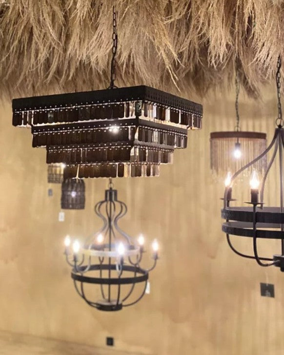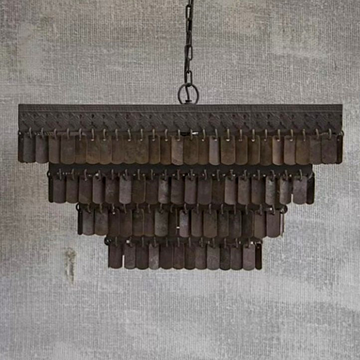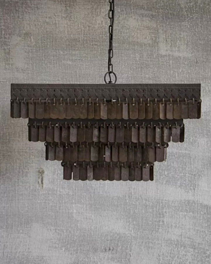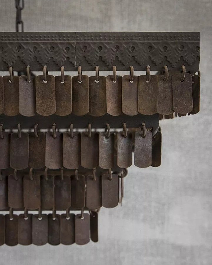 Lámpara colgante Gudha de Hoffz, cuadrada. La reconocida línea de lámparas Gudha de Hoffz Interior. Las lámparas de esta colección se caracterizan por una estructura de hierro con pequeños colgantes rectangulares, creando un diseño robusto y refinado a la vez. Tras su fabricación, las lámparas se exponen a la intemperie, un tratamiento que les confiere su característico aspecto envejecido. Un atractivo adicional: cada pieza es única.