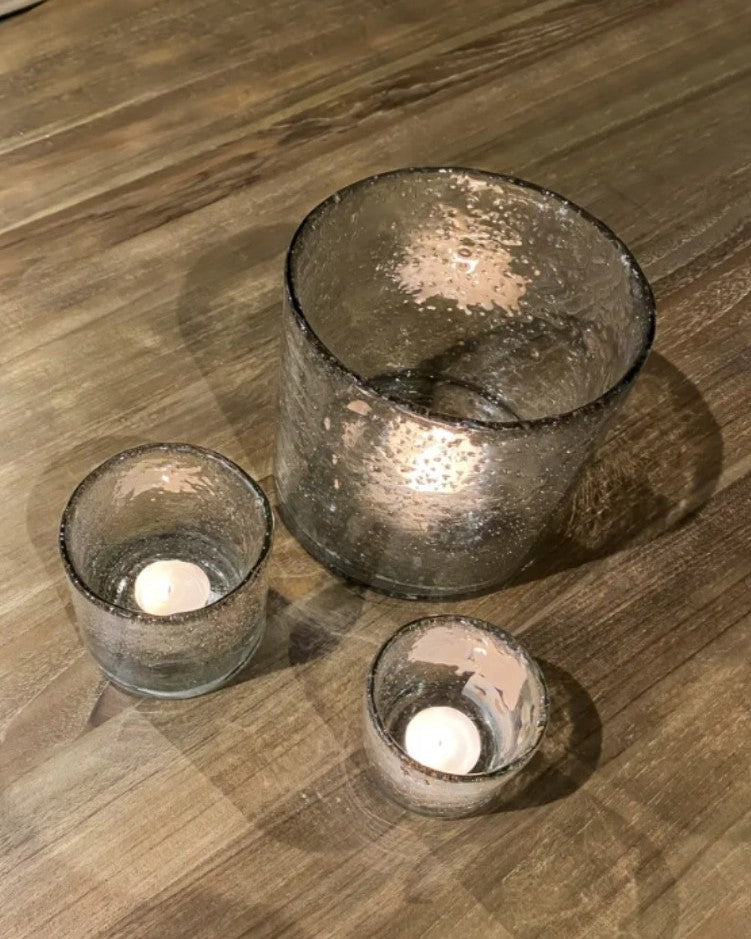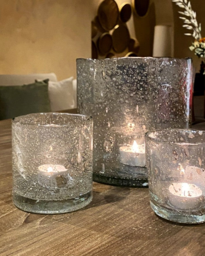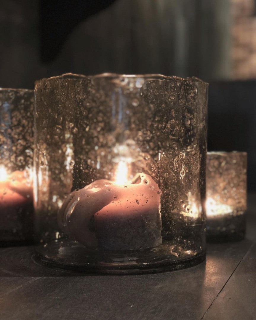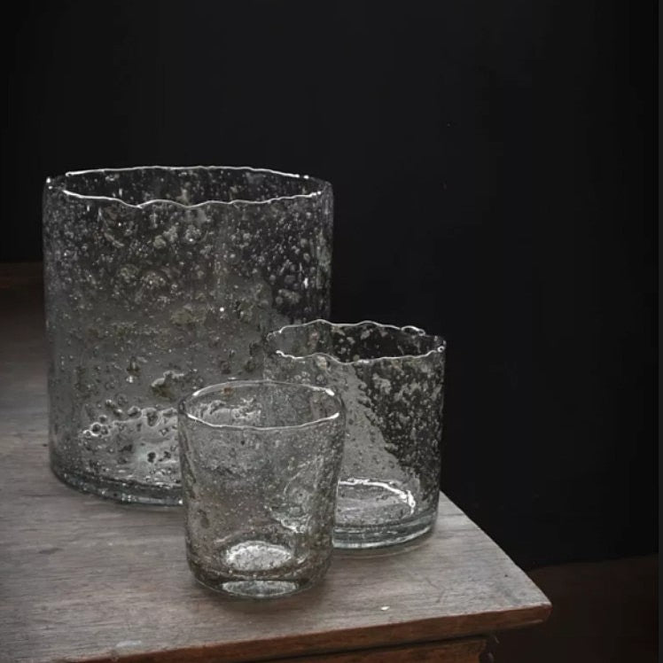 Windlicht Bubbels grandes de Hoffz. Estos faroles se integran a la perfección en cualquier interior y crean un hermoso y evocador reflejo de luz. El método especial de soplado de vidrio crea pequeñas burbujas en el vidrio, creando una apariencia única. Los faroles están disponibles en tres tamaños diferentes.