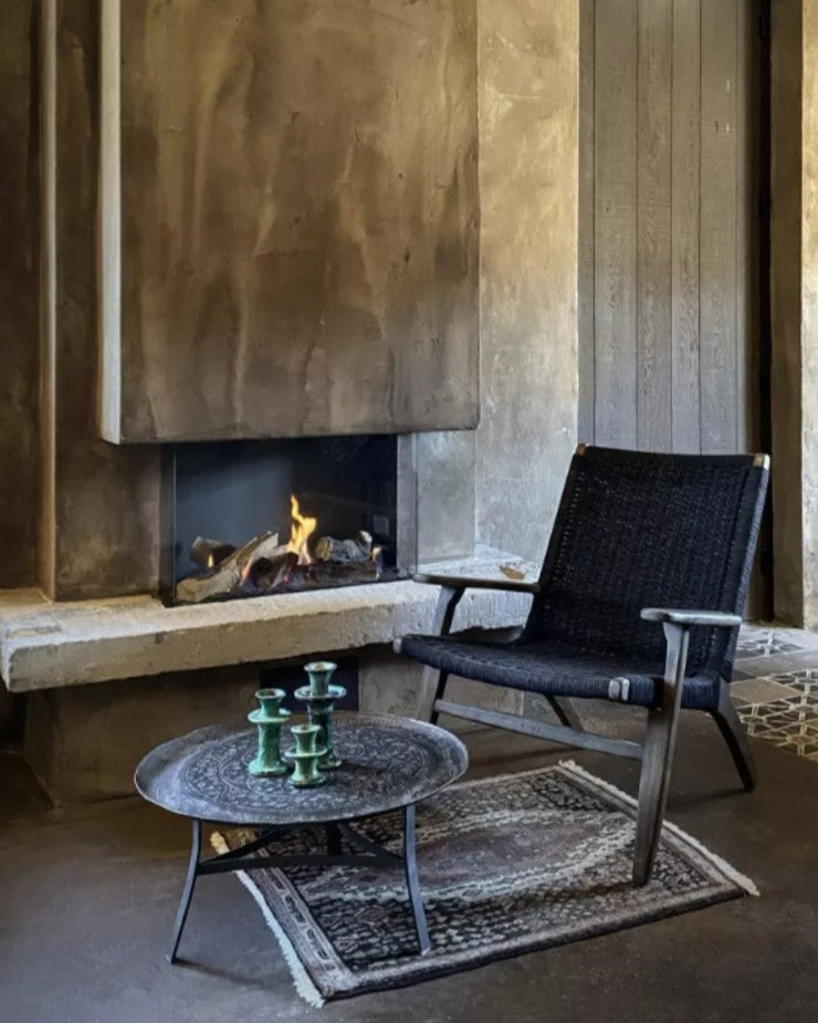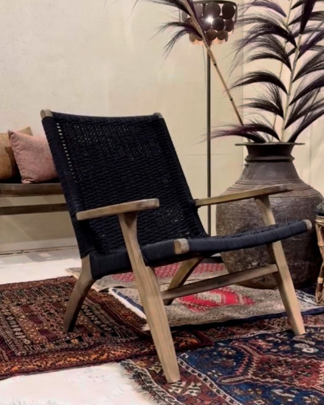 Benin chair. Benin is a beautiful indoor chair, and its sloping seat makes it incredibly comfortable. The frame is made of finished teak, and the seat is made of bonded and woven natural fiber in a black shade. Its cosmopolitan yet elegant appearance makes it a welcome addition to any sophisticated interior.