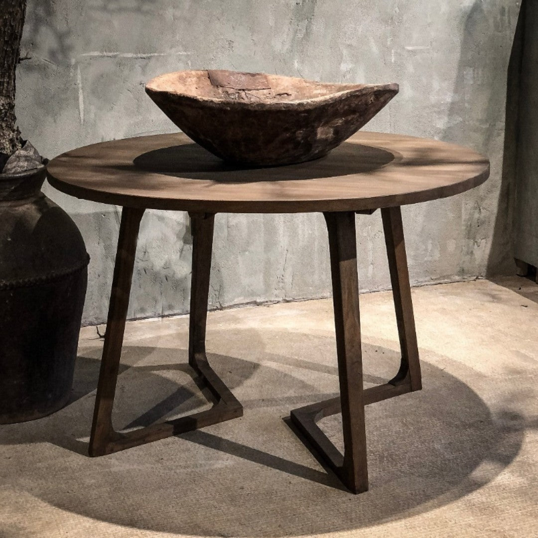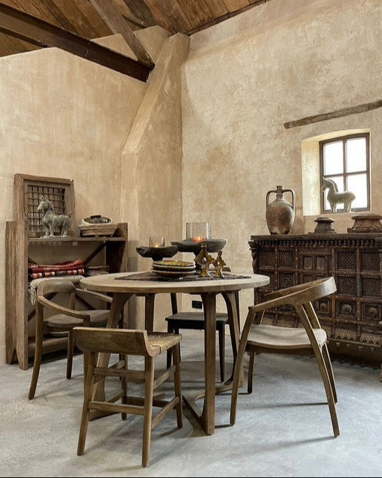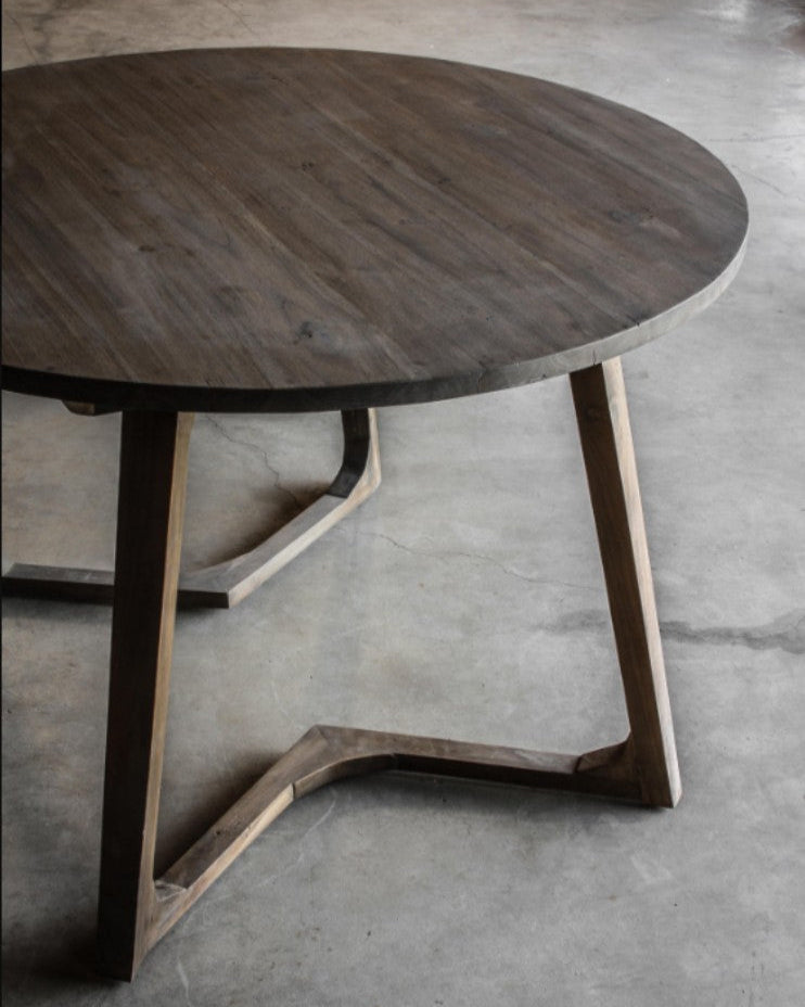 Table Yaro van Hoffz. Round shapes combined with clean lines—that's Yaro. A classic, round tabletop with a playful twist in the shape of the legs. Both the legs and the tabletop of Yaro are made of teak, with small imperfections adding to the table's charm. Combined with the dining chairs from the teak collection, this table forms a perfect whole.
