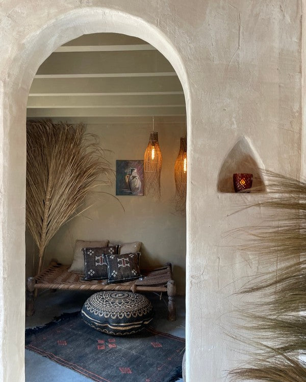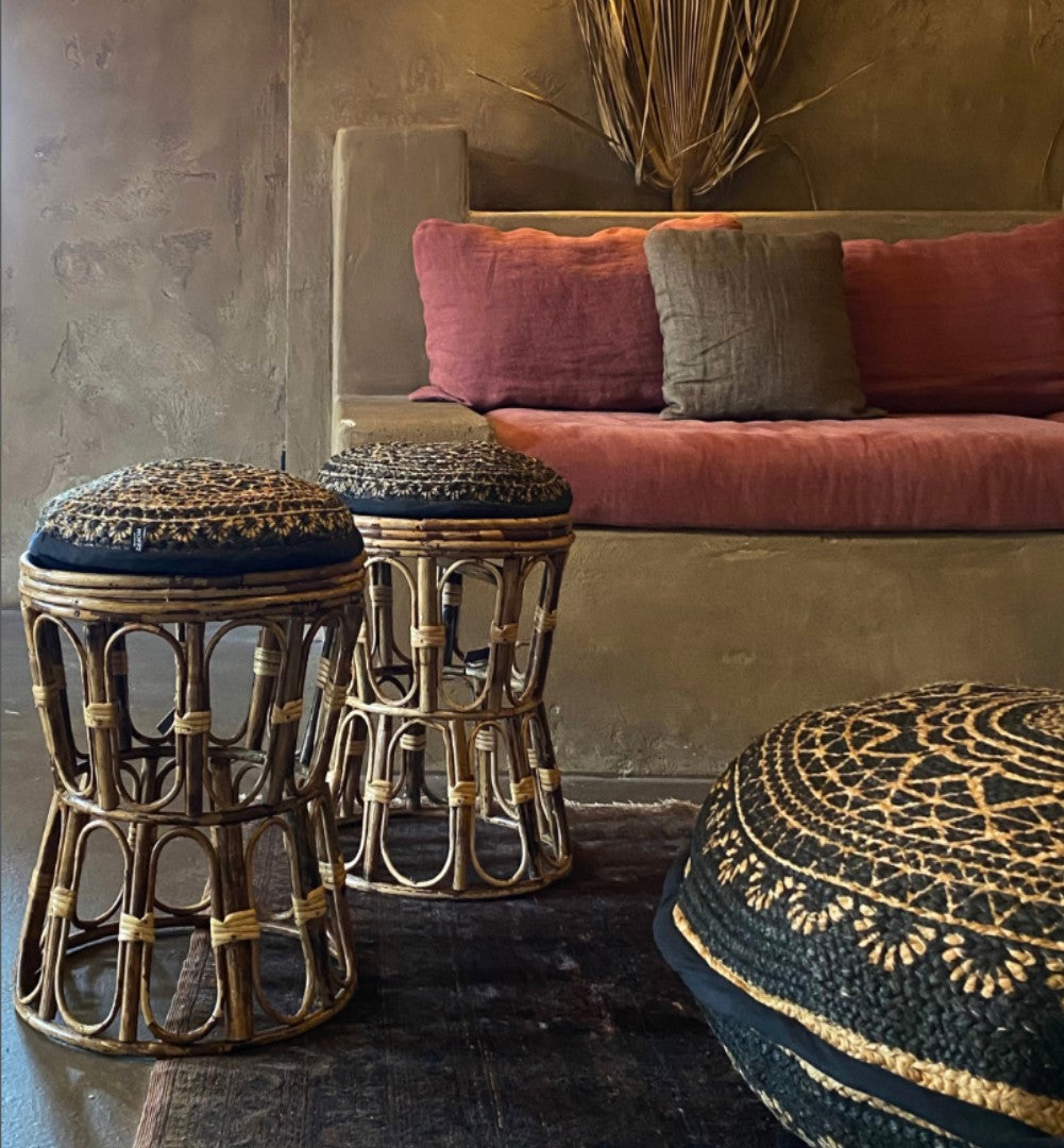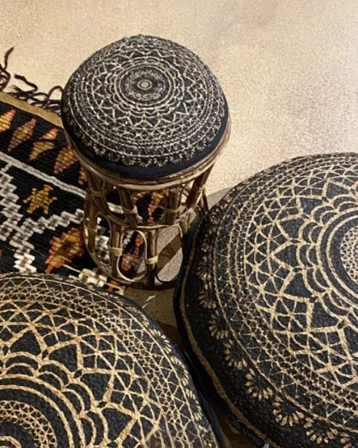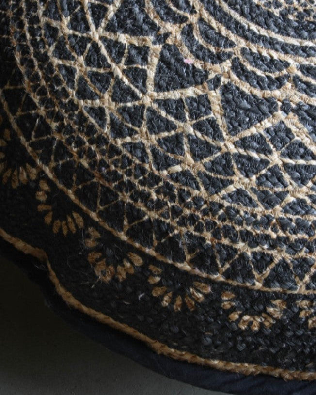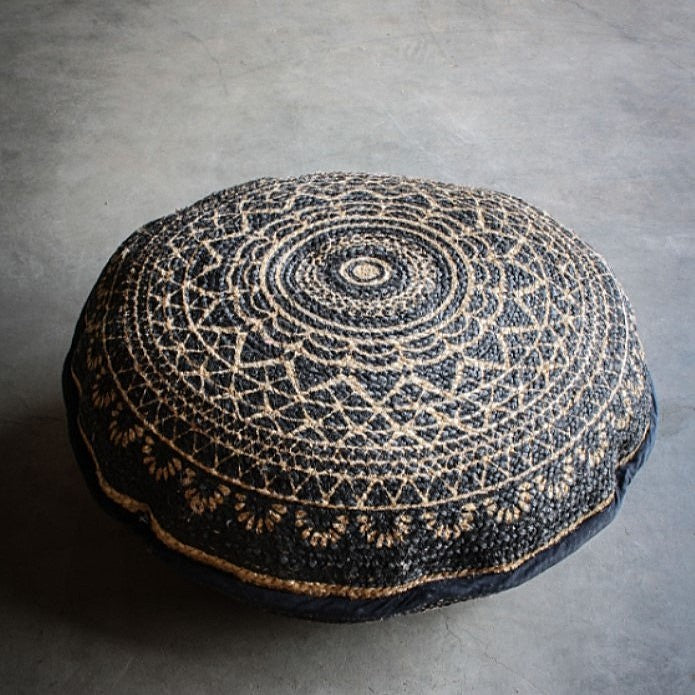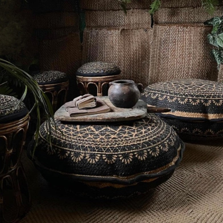 Daya floor cushion from Hoffz. These beautiful round floor cushions are made of jute and filled with a polyester-cotton blend. With their 85 cm diameter, they're a real eye-catcher in a cosmopolitan interior! Place several together to create a wonderful lounge area, or use them as extra seating in your living room. Please note:The print and jute may discolour if the floor cushion is placed in full sunlight.