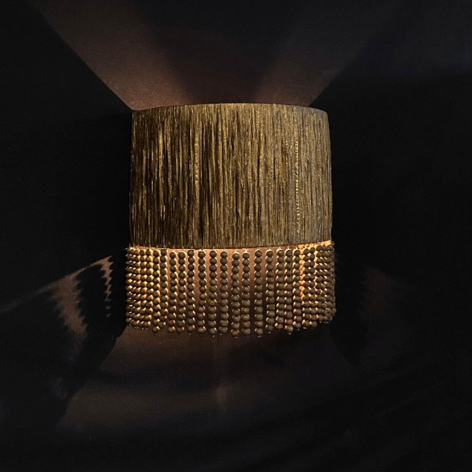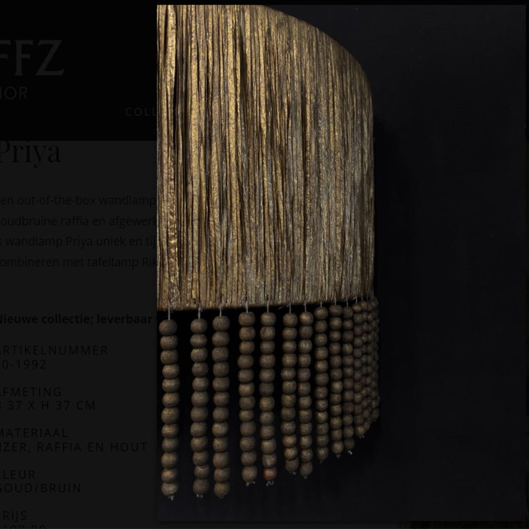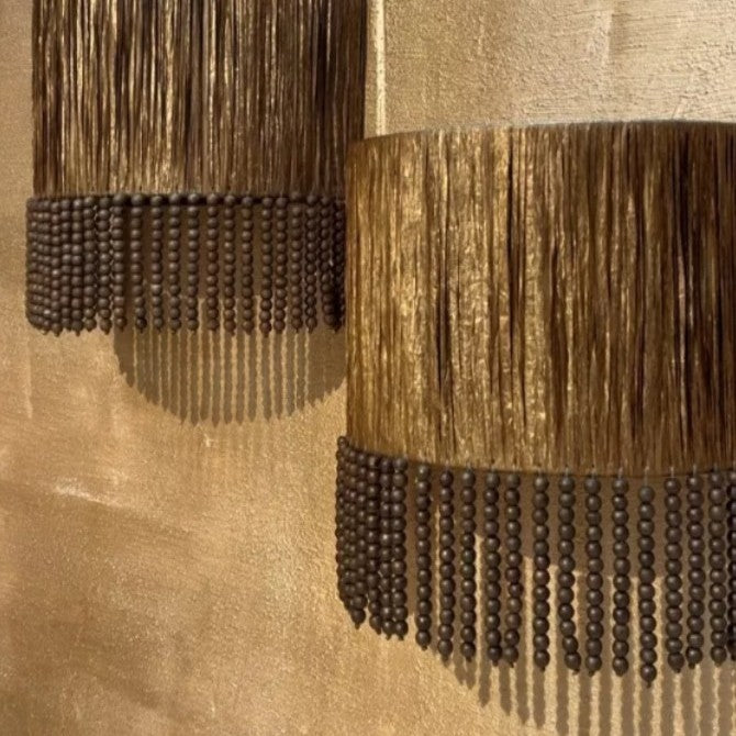 Priya wall lamp. Priya is an out-of-the-box wall lamp! Clad in golden brown raffia and finished with wooden bead strings Priya wall lamp, unique and timeless.
