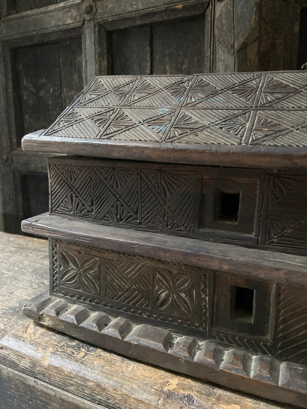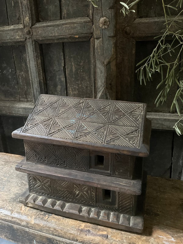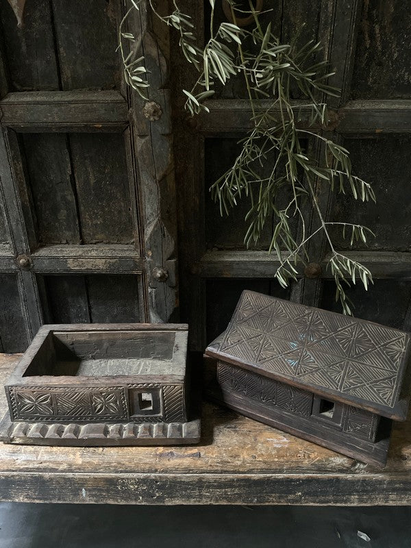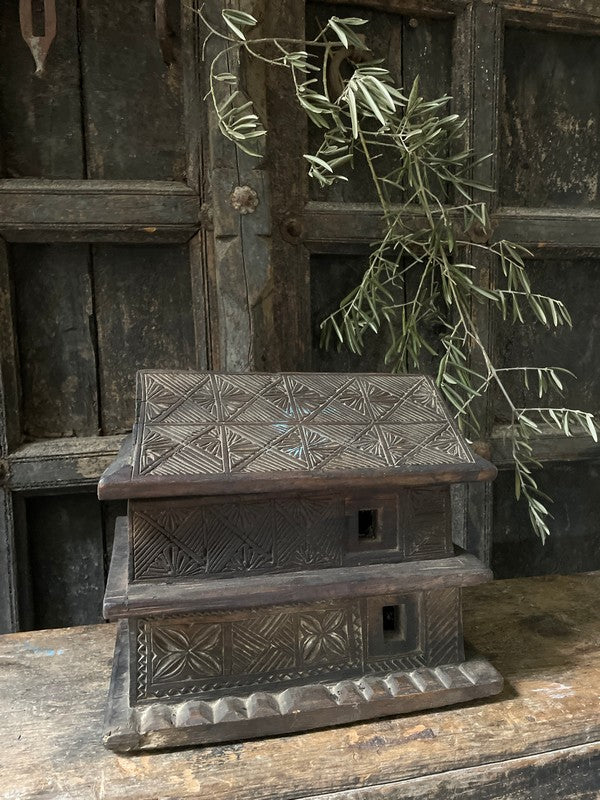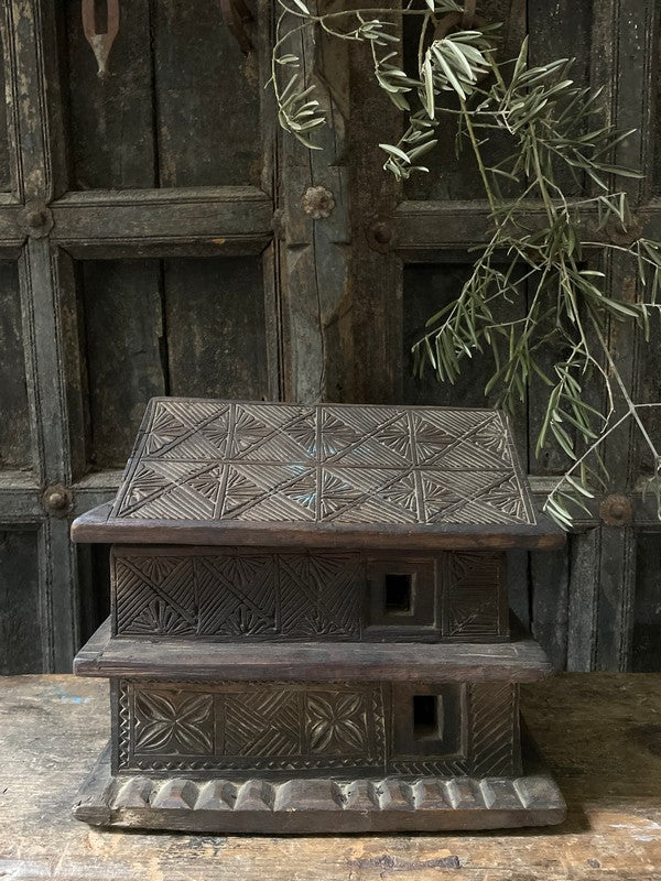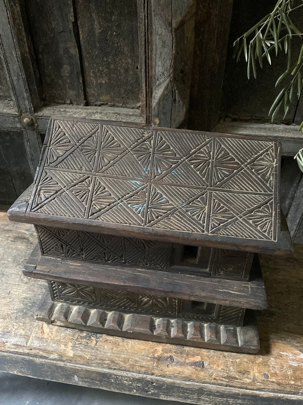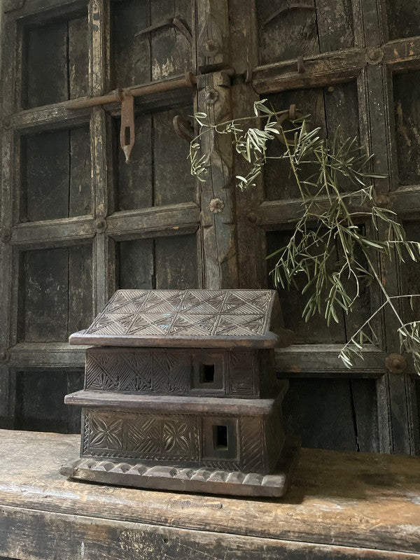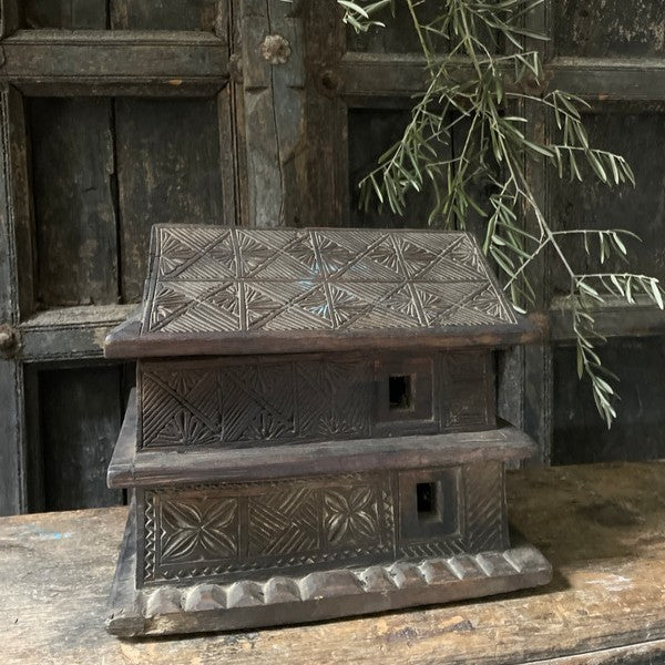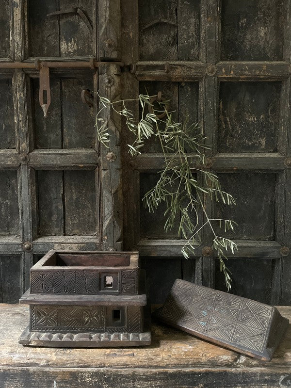 Old wooden temple house from Nepal. Beautiful, timeworn and understated, this container has two layers that slide apart. A lovely eye-catcher.
