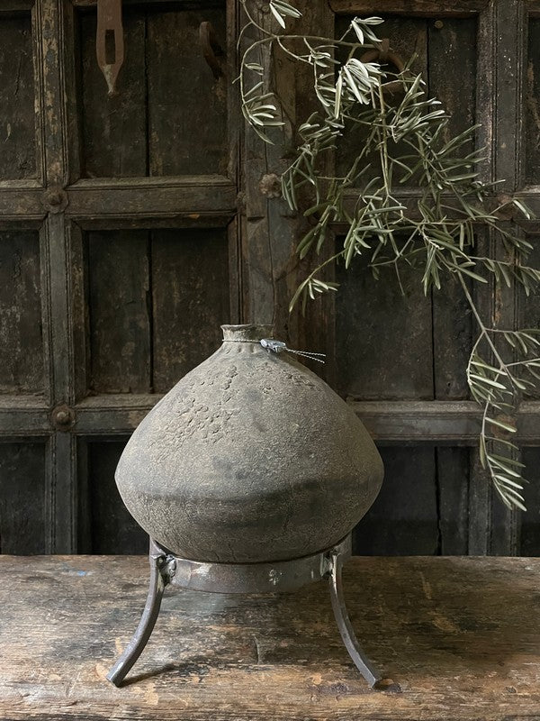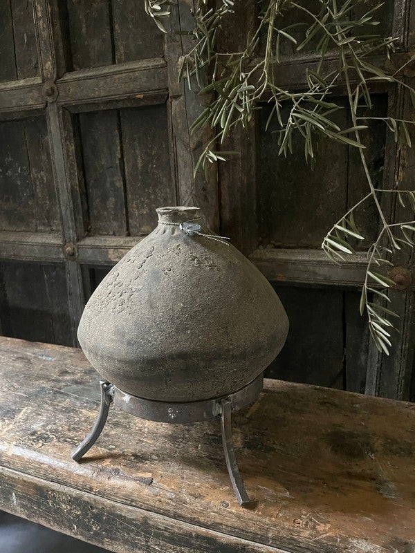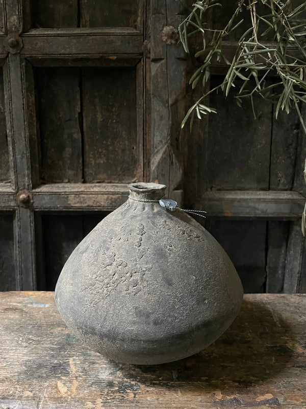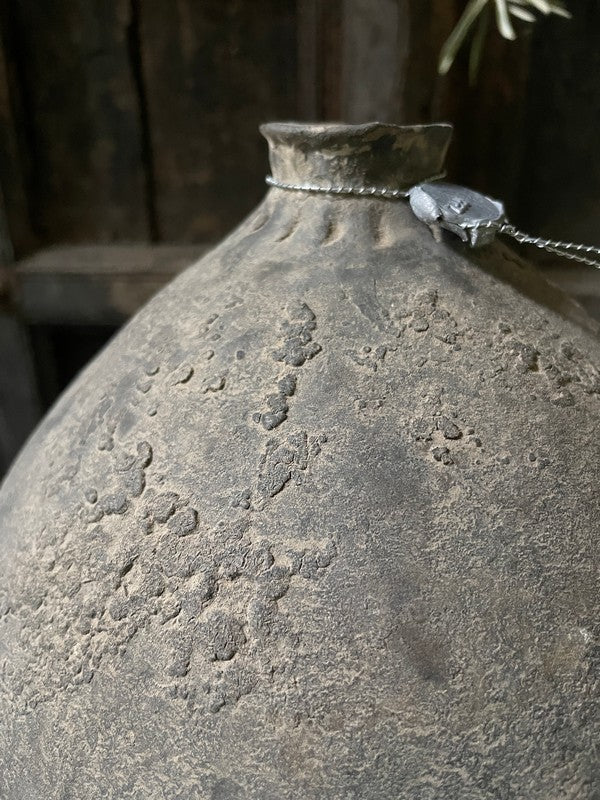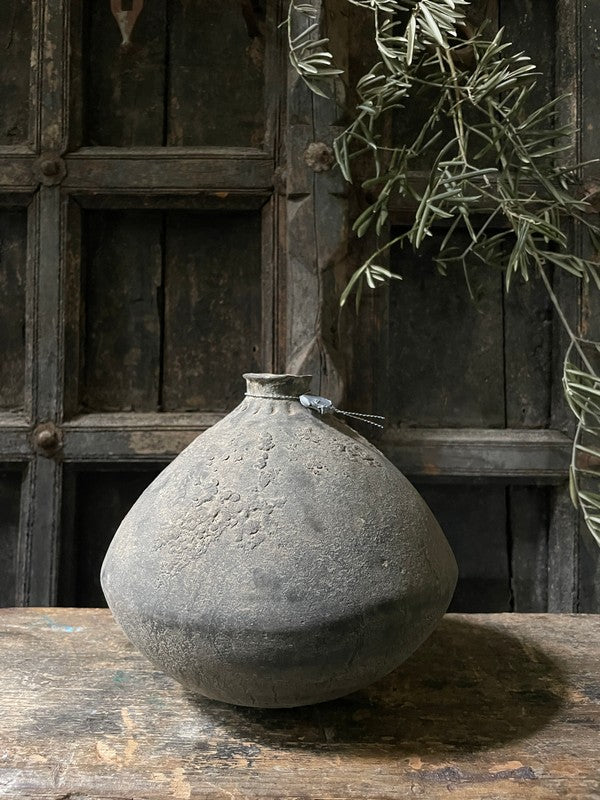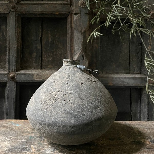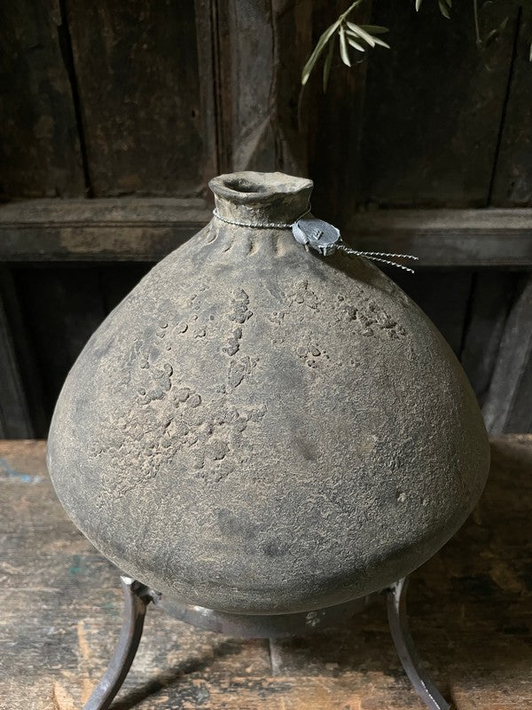 Jarra de barro nepalí. Preciosa jarra de barro de Nepal, con un aspecto envejecido y de líneas sencillas. Esta auténtica jarra hecha a mano es una pieza única que no necesita adornos. Incluye un anillo de hierro para sujetarla, pero incluso sin él, luce igual de hermosa. También queda estupenda en un cuenco de madera.
