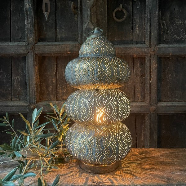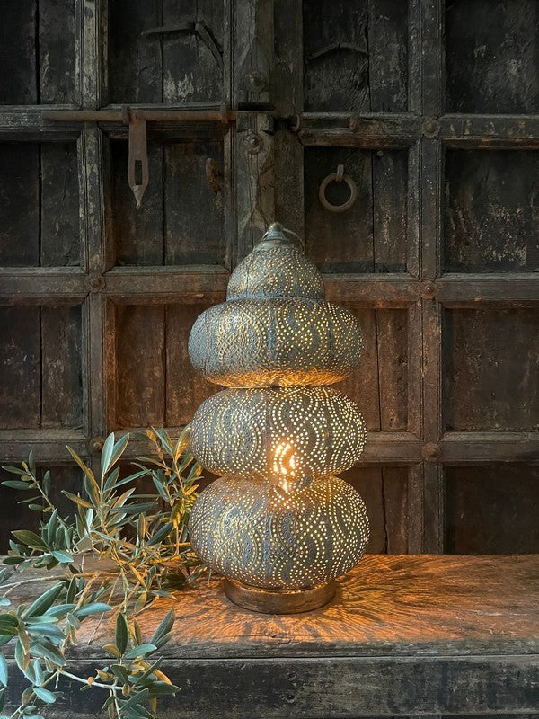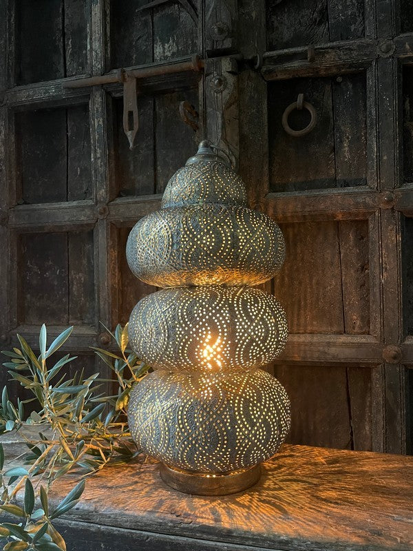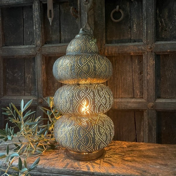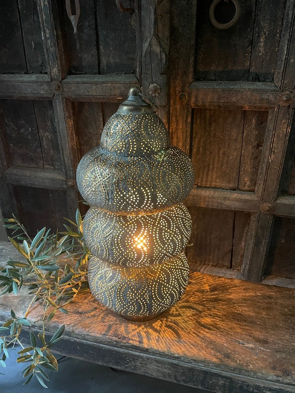 Lámpara de mesa oriental. Una encantadora lámpara de mesa cuya luz se filtra bellamente a través de los orificios. Esta lámpara de metal tiene un acabado vintage en tonos marrón, dorado y gris, y también luce hermosa en una mesita de noche o en un recibidor, por ejemplo.